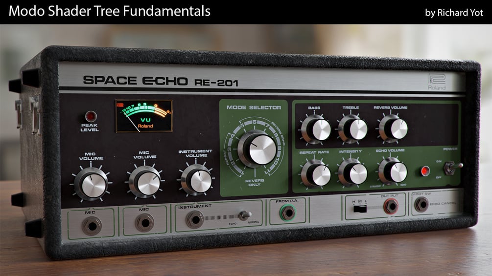Finally there is also a longer step-by-step video that walks you through the process of shading and texturing the vintage tape delay in the main illustration. I’ll show you how to create and apply convincing wear and tear to your materials to create photoreal shaders and textures. Particular attention is paid to creating convincing metals, with anisotropic maps as well as bump and roughness maps. Many of the textures used are derived from my existing kits, but all the assets required to follow along are also included in this training.